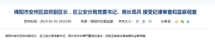 在王万涛落马之前,今年1月3日,绵阳市安州区副区长,区公安分局局长岳兵落马,岳兵也是一位“老警察”,在绵阳市公安系统工作多年。