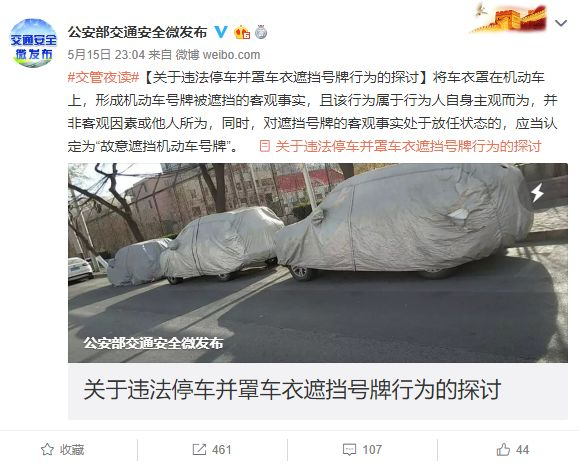 原标题:公安部交管局官微:道路停车罩车衣是故意遮挡号牌,扣12分