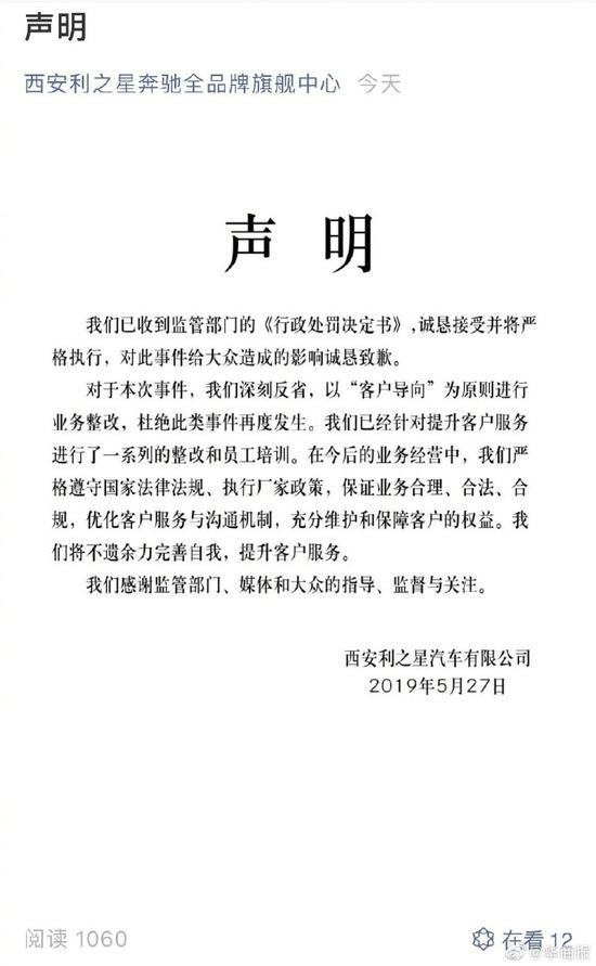 西安奔驰利之星4S店声明:接受处罚决定并诚恳致歉