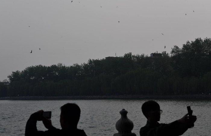 4月17日傍晚,北海公园,拍摄雨燕的市民。