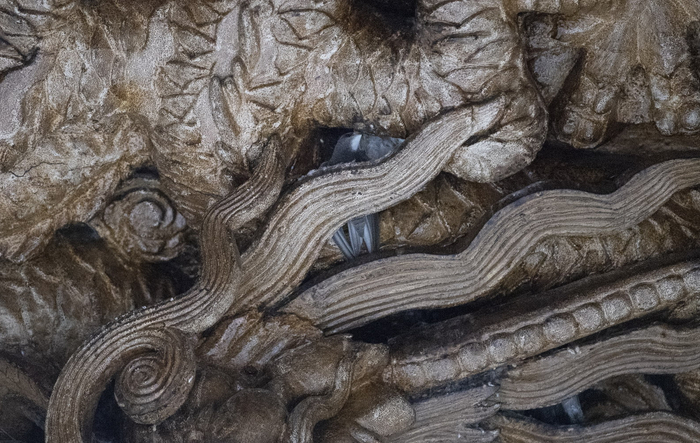 北海公园五龙亭,在阴暗的木结构缝隙中安家的雨燕探出了头。