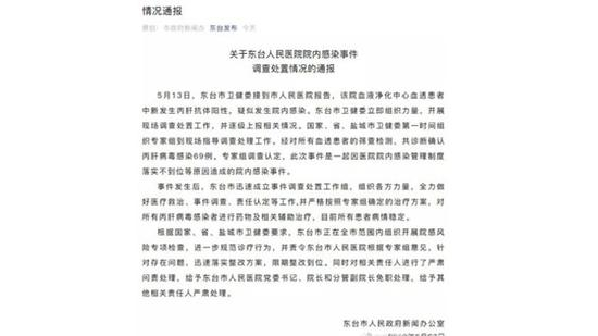 5月27日,中共东台市委宣传部微信公号“东台发布”通报称,东台市人民医院确认丙肝病毒感染69例。专家组调查认定,此次事件是一起因医院院内感染管理制度落实不到位等原因造成的院内感染事件。东台市人民医院党委书记、院长和分管副院长免职处理。