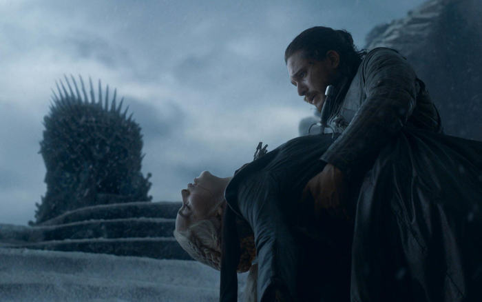 《权游》第八季大结局,雪诺抱着龙妈的尸体。
