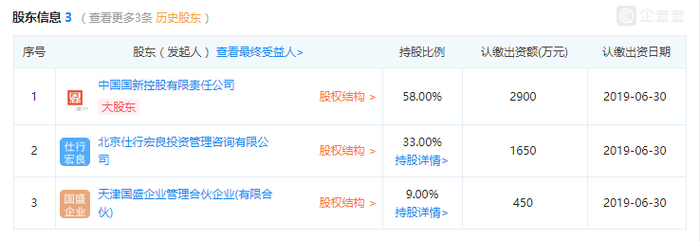 工商资料显示,大公国际资信评估有限公司股东从北京化行宏良投资管理咨询有限公司、大公国际信用评级有限公司变更为中国国新控股有限责任公司(简称“中国国新”)、北京仕行宏良投资管理咨询有限公司和天津国盛企业管理合伙企业,持股比例分别为58%、33%、9%。