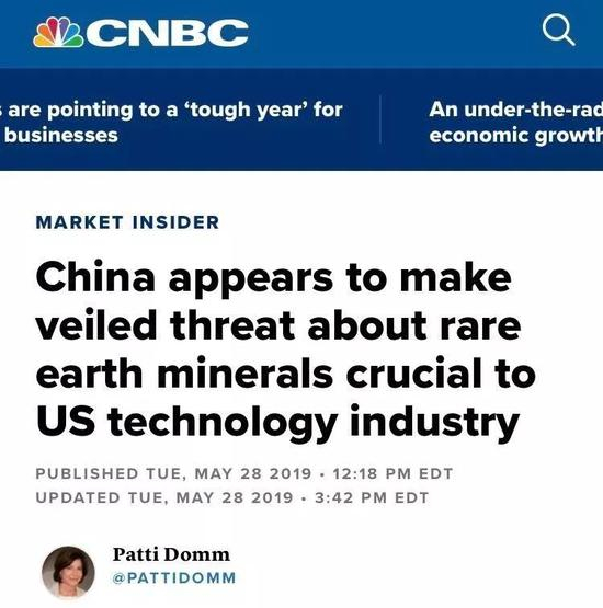 美国媒体CNBC发布文章称:“关于稀土,中国似乎做出了含蓄的威胁,这是对美国科技产业至关重要的一种矿物质”。