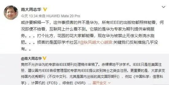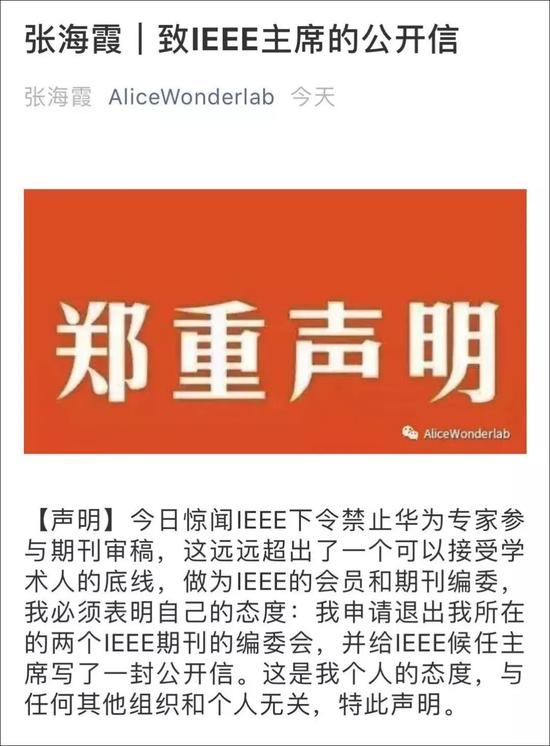 “惊闻IEEE下令禁止华为专家参与期刊审稿,这远远超出了一个学术人可以接受的底线,做为IEEE的会员和期刊编委,我不得不必须有自己的态度:我已经申请退出我所在的两个IEEE期刊的编委会,并给IEEE候任主席写了一封公开信,这是我个人的态度,与任何其他组织和个人无关。”