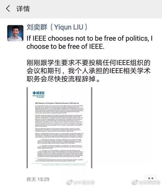 此外,清华大学计算机科学与技术系副教授刘奕群也在朋友圈宣布,“我个人承担的IEEE相关学术职务会尽快按流程辞掉”,并表示已经“跟学生要求不要投稿任何IEEE组织的会议和期刊”。