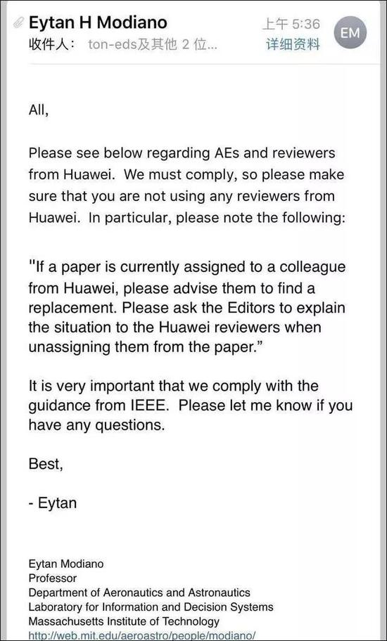 发件人是IEEE网络相关学报的副主编、麻省理工学院教授艾坦·莫迪亚诺(Eytan H Modiano)。
