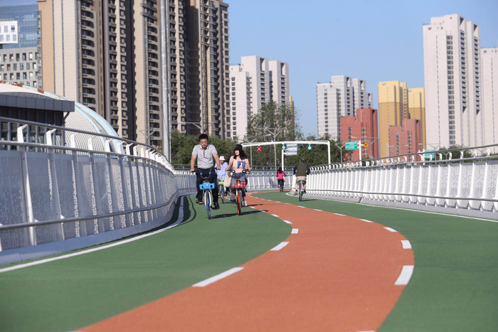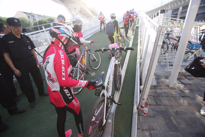自行车专用路全程设置8个出入口,并与既有道路相连接,相邻两个出入口的平均间距为700米左右。为方便骑行者上下道,其中6个桥梁出入口坡道首次设置了自行车助力装置。