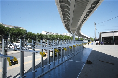 按照设计初衷,这条自行车专用路主要解决的是回龙观和上地间的市民通勤问题。而为了治理地铁周边的停车乱象,在自行车专用路的每个出入口处都安装有自行车停放设施,一共能停放4900余辆自行车,严禁将自行车直接停放在专用路上。记者体验时发现,这种停车装置非常便于操作,将车辆轮胎放入支架,确保卡牢后,用手轻轻一提黑色的把手,停车架即可升至固定高度。