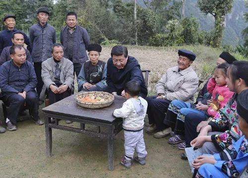 2013年11月3日,习近平在湘西土家族苗族自治州花垣县排碧乡十八洞村与村干部、村民座谈时亲切地给小朋友递花生。