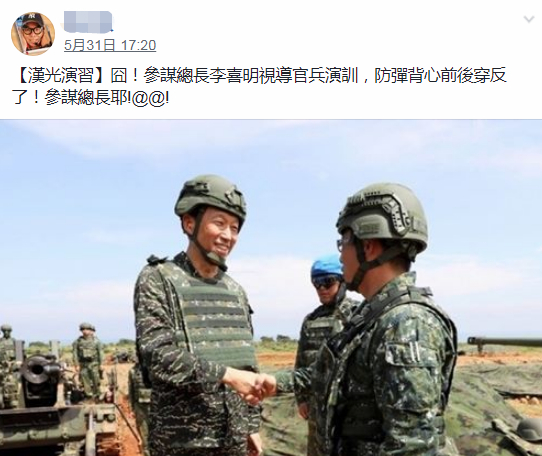 今年的台军“汉光35号”军演5月27日至31日举行,在30日的“联合反登陆实弹射击”中,李喜明到现场参加。不过,其头戴防护头盔、身穿防弹背心的照片被公开后,有眼尖的网友看出,李的防护背心居然穿反,前、后颠倒。