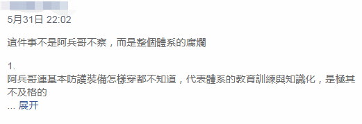 更有人分析,这件事体现的是台军“整个体系的腐烂”:阿兵哥连基本防护装备怎样穿都不知道,代表体系的教育训练与知识化,是极其不及格的;在李喜明周围的一堆官,到底是一堆前后不分的蠢材,同样对基本防护装备的使用没有任何狗屁概念。
