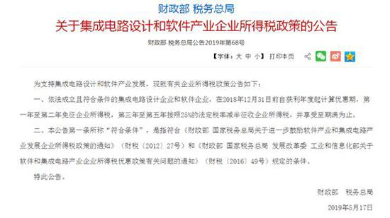 除此之外,中国政府也为华为送上了大礼物,2019年5月17日财政局和国家税务总局联合发文,对集成电路设计和软件产业企业前两年免征企业所得税,这是个及时雨。