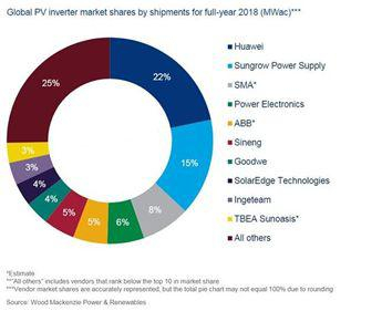 例如光伏逆变器,下图是2018年的全球出货量排名,第一名就是华为,占全球22%。
