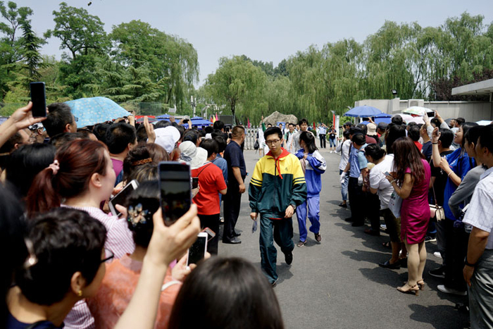 101中门外,一位考生见到父亲后与其击掌相庆。