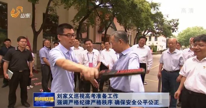 刘家义来到济南中学考点,按照考场纪律和要求,检查视频监控系统、听力系统运行情况,体验考生入场安检工作,查看学生物品存放处、饮水处、卫生室等服务设施,询问考试各环节的准备情况。他走进教室,按照考试流程对照检查,查看监控设备、桌椅讲台等,与监考老师交流工作,叮嘱他们要切实负起责任,严格做好安检、监考工作,确保服务到每个考生,使每个环节都安全顺畅。
