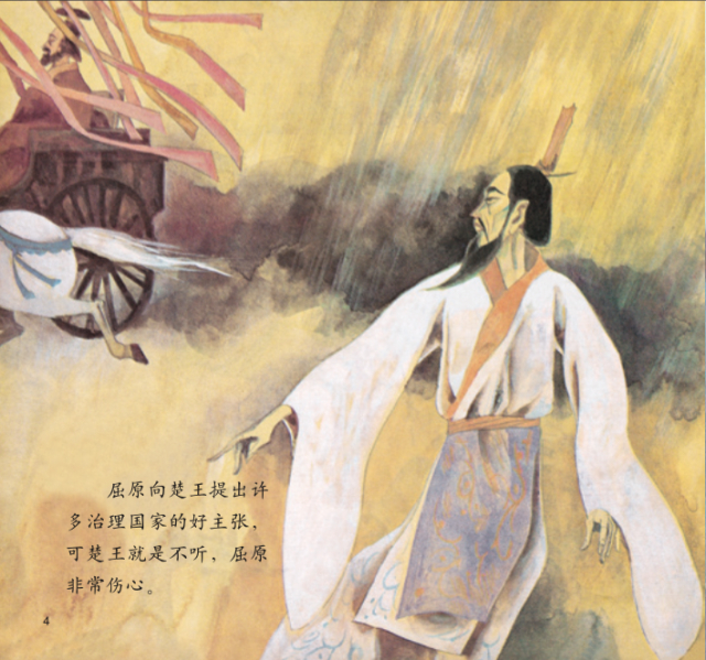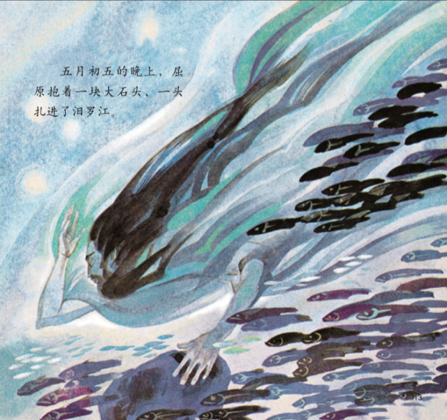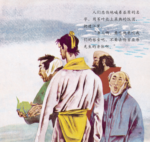 人们悲伤地喊着屈原的名字,往江里扔用芦苇包好的饭团。“鱼儿,来吃我们的粮食,不要伤害屈原先生的身体!”