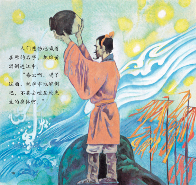 人们喊着屈原的名字,把雄黄酒也倒入江中,“毒虫啊,喝了酒就乖乖醉倒,不要咬屈原先生的身体!”