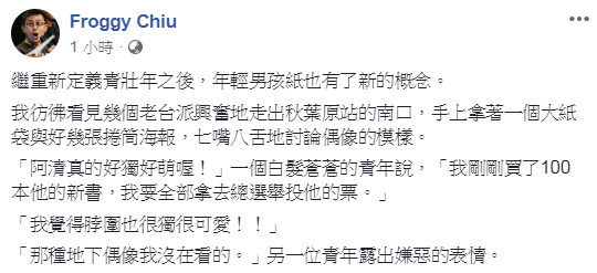 而绰号“呱吉”的台北市议员邱威杰则开玩笑说,“继重新定义青壮年之后,年轻男孩纸也有了新的概念”。