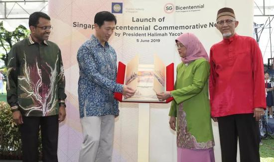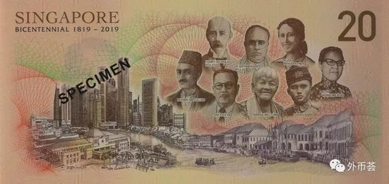 背面则印着19世纪初,来到新加坡的8位先驱人物。新钞的右下角代表最初开埠时舟车繁忙、欣欣向荣的新加坡,左边则是如今摩天大厦鳞次栉比的金融中心新加坡。古今被一条弯弯的新加坡河串联起来,象征着历史源远流长。