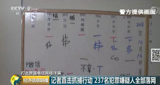 三楼的墙壁上有两块白板,左边的白板记录了嫌疑人实施电信诈骗的所谓业绩。