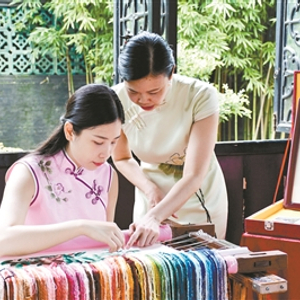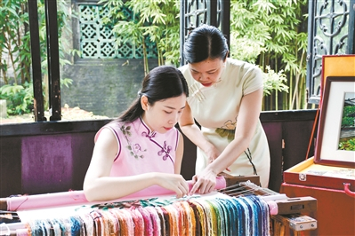 在余荫山房最具标志性的景点玲珑水榭,展示的非遗项目是广绣。广绣大师梁秀玲一家现场支起绣架为游客展示针法。“广绣在这里展演,好像回到了家。这样的园林美景正如绸缎上的画。园林与广绣,两者最匹配了。”