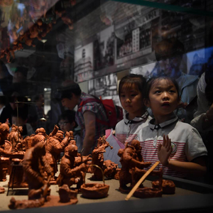 小朋友们观看反映老北京生活的泥塑。摄影/新京报记者 李木易