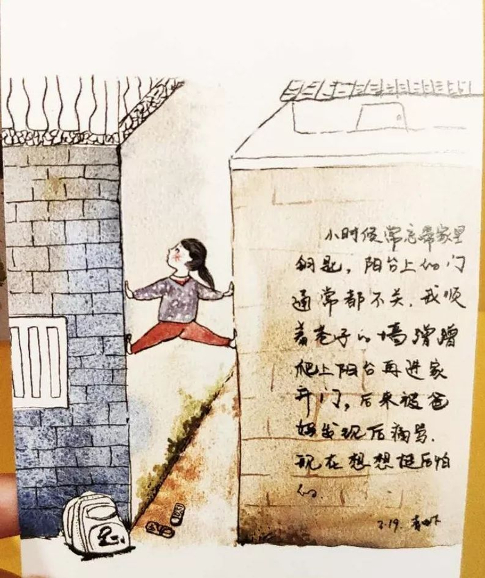 “小时候常忘带家里钥匙。阳台上的门通常都不关。我顺着巷子的墙蹭蹭爬上阳台再进家开门。后来被爸妈发现后痛骂,现在想想也挺后怕的。”