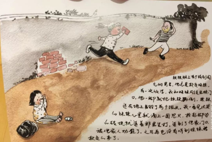 “班上有个淘气包男孩总是欺负妹妹。有一次放学,我和妹妹刚走出校门口,他一脚就把妹妹踢倒。妹妹还在地上翻了两个跟头。我看着大哭的妹妹心里就涌上一团怒火,拾起脚边的石头就追着男生打,追到他家门口,被他家人劝住了。之后再也没有听到妹妹被人欺负的事了。”