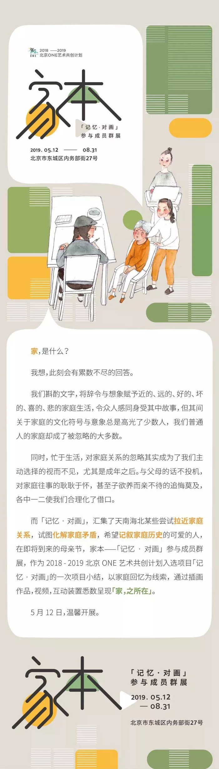 朋友涂涂看到我画的“唤醒妈妈记忆”系列后给我推送了北京ONE面向社会招募的艺术共创计划的招募广告。于是我做了一份方案——“记忆·对画”成功入选,“记忆·对画”主要聚焦代际交流,青老两代人凭借记忆中的人事物为话题进行对话,并通过绘画、文字、剪贴、摄影等多种方式来呈现,引发年轻一代对衰老和死亡的认识与思考。