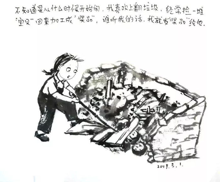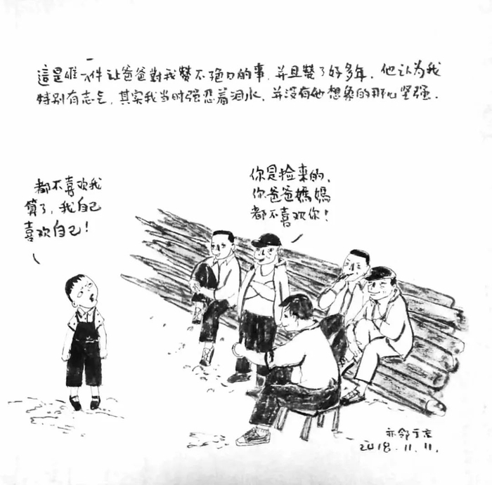 我画我小时候为了讨父母欢心,和木工叔叔搞好关系帮家里拿来烧火的木头。我画我像个假小子,不像姐姐妹妹那么乖巧讨喜。我穿着黑色的背带裤,梳着简单的辫子,喜欢爬墙,浑身脏兮兮,喜欢到垃圾堆里淘东西做二次加工——比如把废牙刷做成发夹。爸爸妈妈说我不像个女孩子,身边的人还是继续叫我“捡来的孩子”。