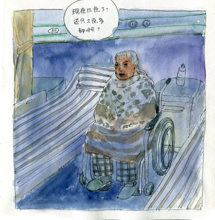 从“不得不面对”到“积极面对”,我逐渐明白了当初火车上的老人和胡老师说过的话。在照顾老人的过程中,我的收获,超越了具体的技能。我明白了只有近距离参与过直系亲人衰老的过程,陪伴过直系亲人走完生命最后阶段,才会直面衰老、死亡——这些平时我们避之不及的话题,才会真正思考我们平时特别不屑的那些很“虚”的问题——比如活着的意义。那段时间我对衰老和疼痛产生了极大的恐惧,我不停地问,当我面临身体的极端疼痛时,我要用什么来支撑自己度过那些难挨的分分秒秒?画画可以吗?
