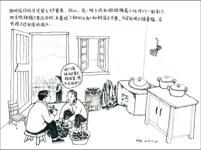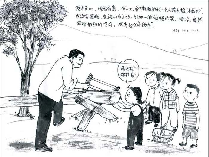 亦邻作品。为了讨父母欢心,亦邻与木工叔叔搞好关系,带回家很多可以烧火的木头。