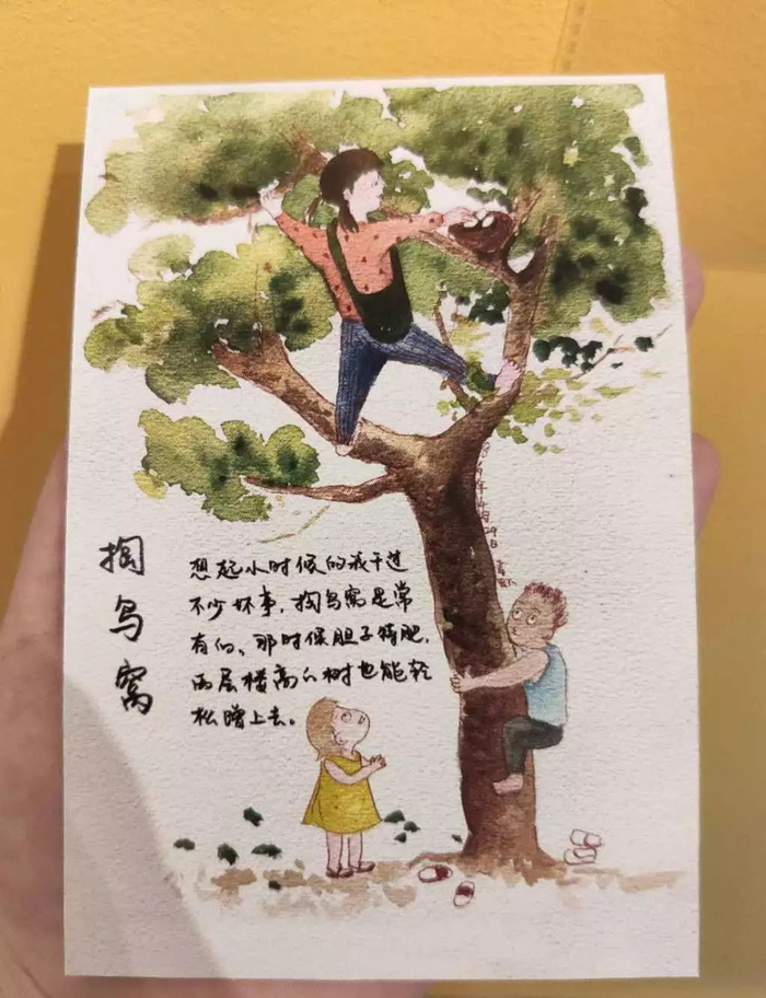 “想起小时候的我干过不少坏事。掏鸟窝是常有的。那时候胆子特肥,两层楼高的树也能轻松蹭上去。”
