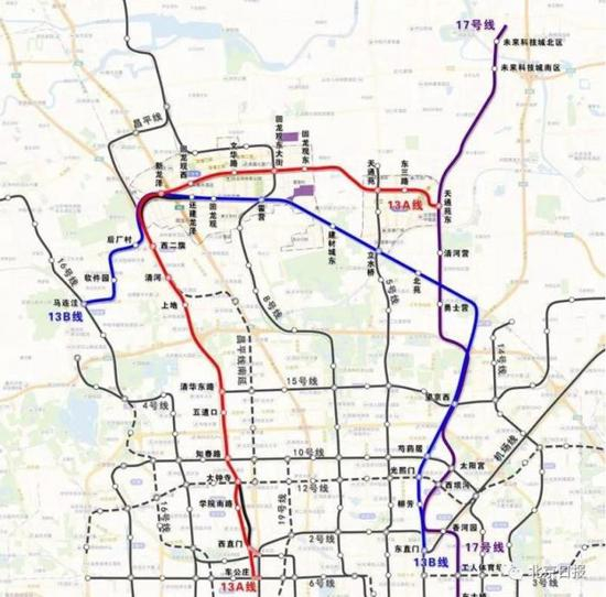 13B线由既有13号线东直门至回龙观站西侧拨线向西延伸至上地软件园,与16号线换乘。线路全长32公里,其中新建工程5.8公里,共设车站15座(含建材城东站),其中换乘站9座。项目力争2019年底开工,2022年底前开通试运营。
