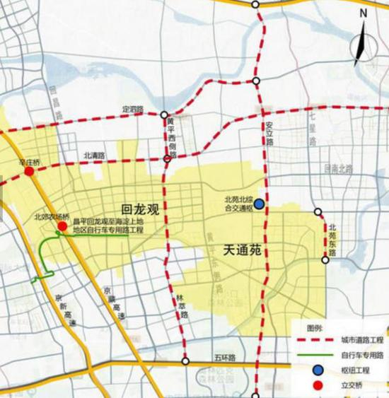 其中,两横是指北清路和定泗路,三纵是指林萃路-黄平西侧路、北苑东路和安立路。