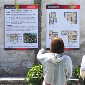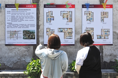 昨日,菜市口附近,市民在申请式退租办公室院内看新房户型图。摄影/新京报记者 王嘉宁