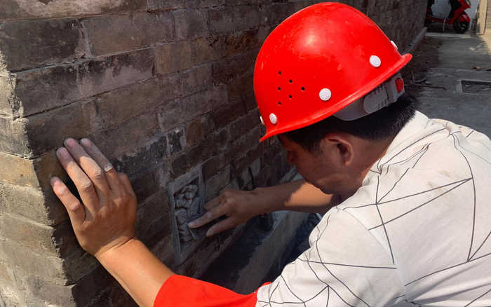 6月12日,工人师傅打磨墙角雕花。新京报记者 李玉坤 摄