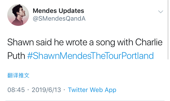 新京报讯(记者 杨畅)北京时间6月13日,“萌德”肖恩·蒙德兹在巡演波特兰站的问答环节透露,他已经和“断眉”查理·普斯共同创作了一首歌曲。消息一出,立即在歌迷中引起热烈讨论。