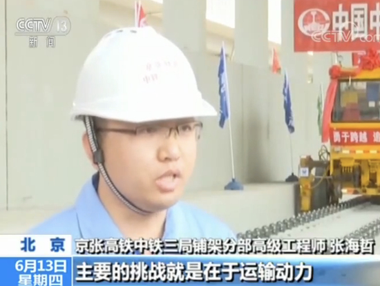 京张高铁中铁三局铺架分部高级工程师 张海哲:主要的挑战是运输动力和施工组织的制动力方面,因为它是长大坡道惯性非常大,如果制动力不足的话很容易对钢轨擦伤。
