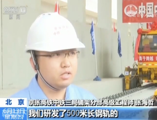 京张高铁中铁三局铺架分部高级工程师 张海哲:从轨料装卸开始我们研发了500米长钢轨的群吊智能监控系统,它是保证在吊装过程中对钢轨质量的一个保证。