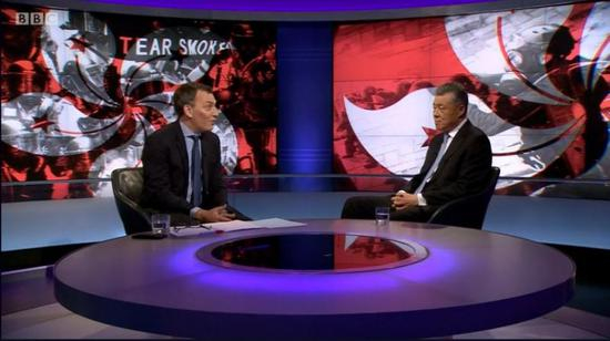 主持人:姑且不说英国政府。你可以看看香港民意,数以万计的香港人,有人说香港人口的十分之一,他们走上街头,他们认为北京不尊重他们选择体制的权利。