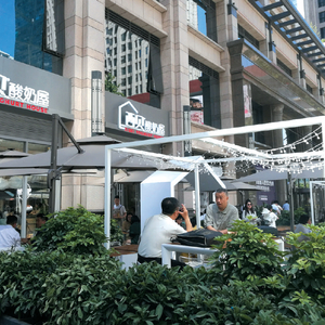 6月10日,在世贸天阶商圈中骏世界城,位于沿街一楼底商的西贝酸奶屋很醒目,服务员在门口引导酸奶试喝,室外设有就餐区,店内设立了酸奶吧、饮品吧、烧烤吧三个吧台,分别负责制作相应的产品。