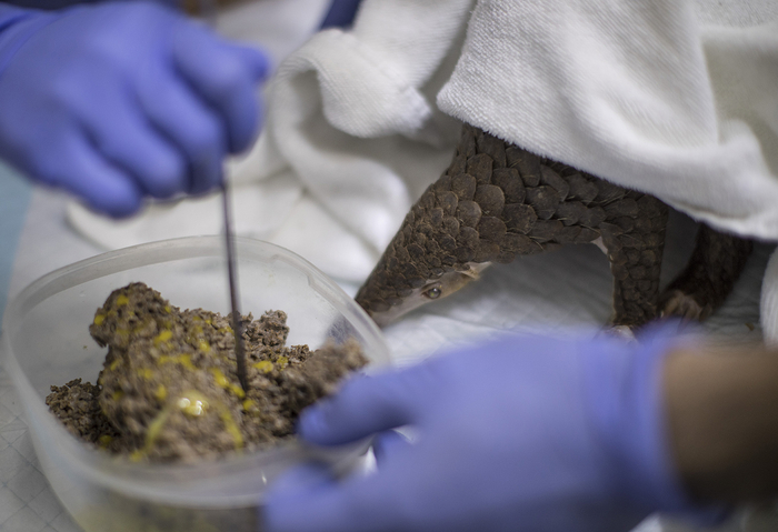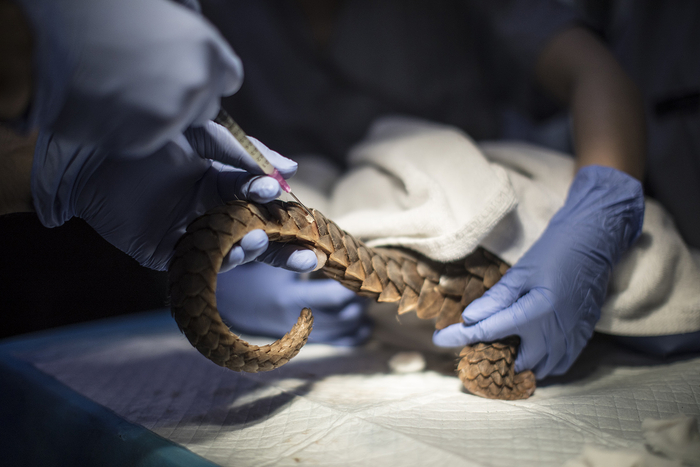 一只被救护的穿山甲尾巴出现化脓,救护人员在对其进行检查和治疗。 受访者供图