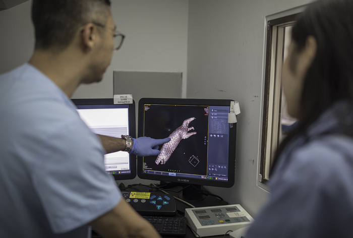 救护人员在观看穿山甲的CT影像。 受访者供图