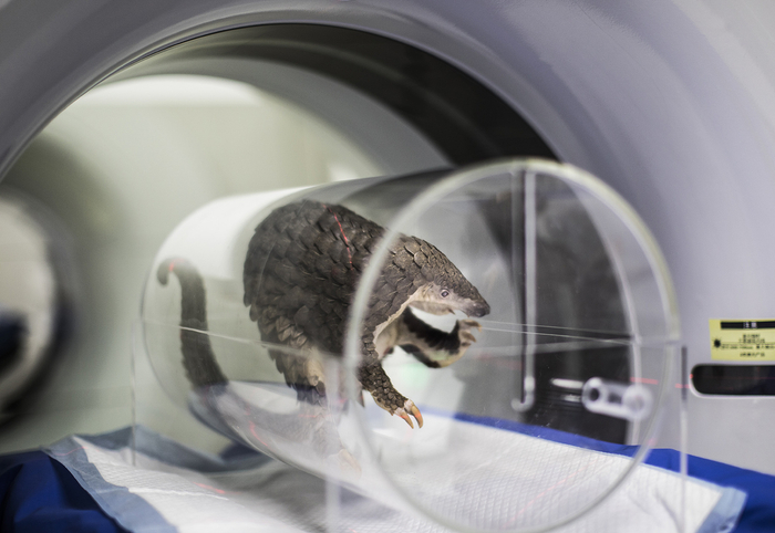 3月底,广东野生动物救护中心接收了一批由海关查没的走私穿山甲。图为一只被救护的穿山甲在动物医院做CT检查。 受访者供图
