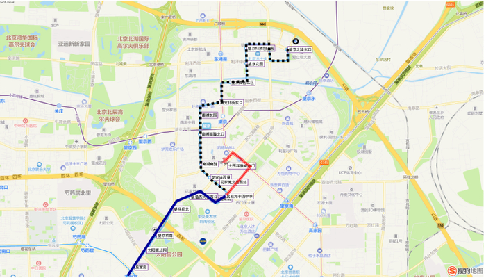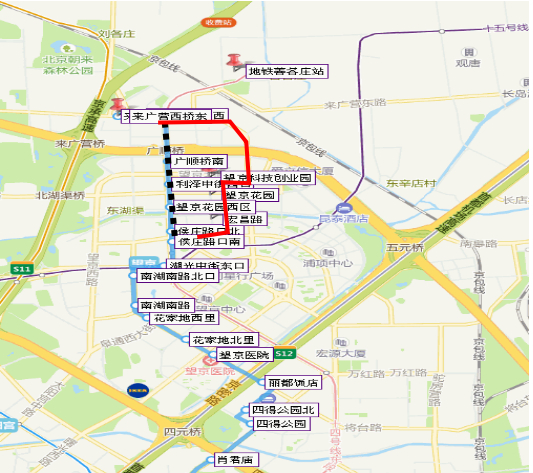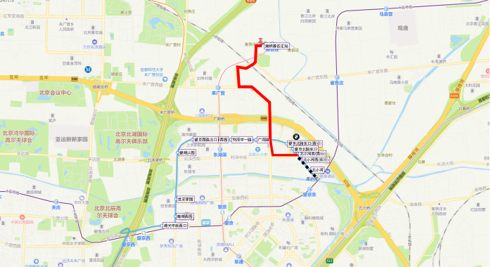 调整后首末站不变,来广营西桥东至广顺南大街北口站位及走向不变,由望花路、花家地街、阜通东大街、花家地南街、京顺路返回原线四元桥西。上行站位及走向不变。线路长度由原来的12.65公里调整至12.8公里,单程计划行驶时间约47分钟。运营时间不变。
