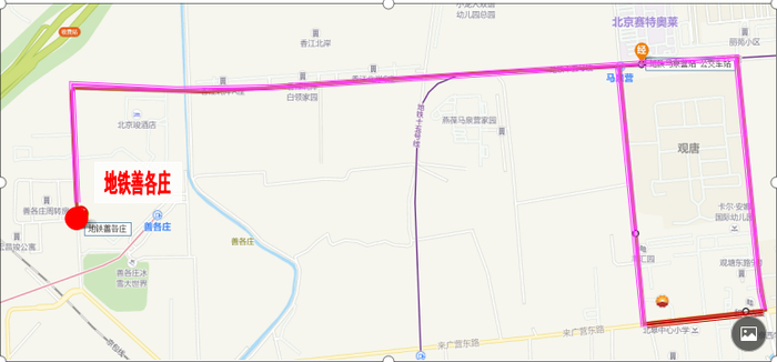 由地铁善各庄出站后走善各庄北路口、香江北路、观唐东路回地铁善各庄。设地铁善各庄、香江北岸C区、地铁马泉营站(东行)等12个站位。线路长度10.2公里;单程计划行驶时间约30分钟。运营时间为5:30--22:00。