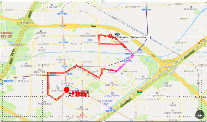 由大西洋新城南门出站后走阜通西大街、南湖南路、启阳路至阜通西大街到大西洋新城南门。设大西洋新城南门、地铁望京站、北小河、北京八十中学东门、启阳路等27个站位。线路长度12公里;单程计划行驶时间约40分钟。运营时间为5:30--22:00。
